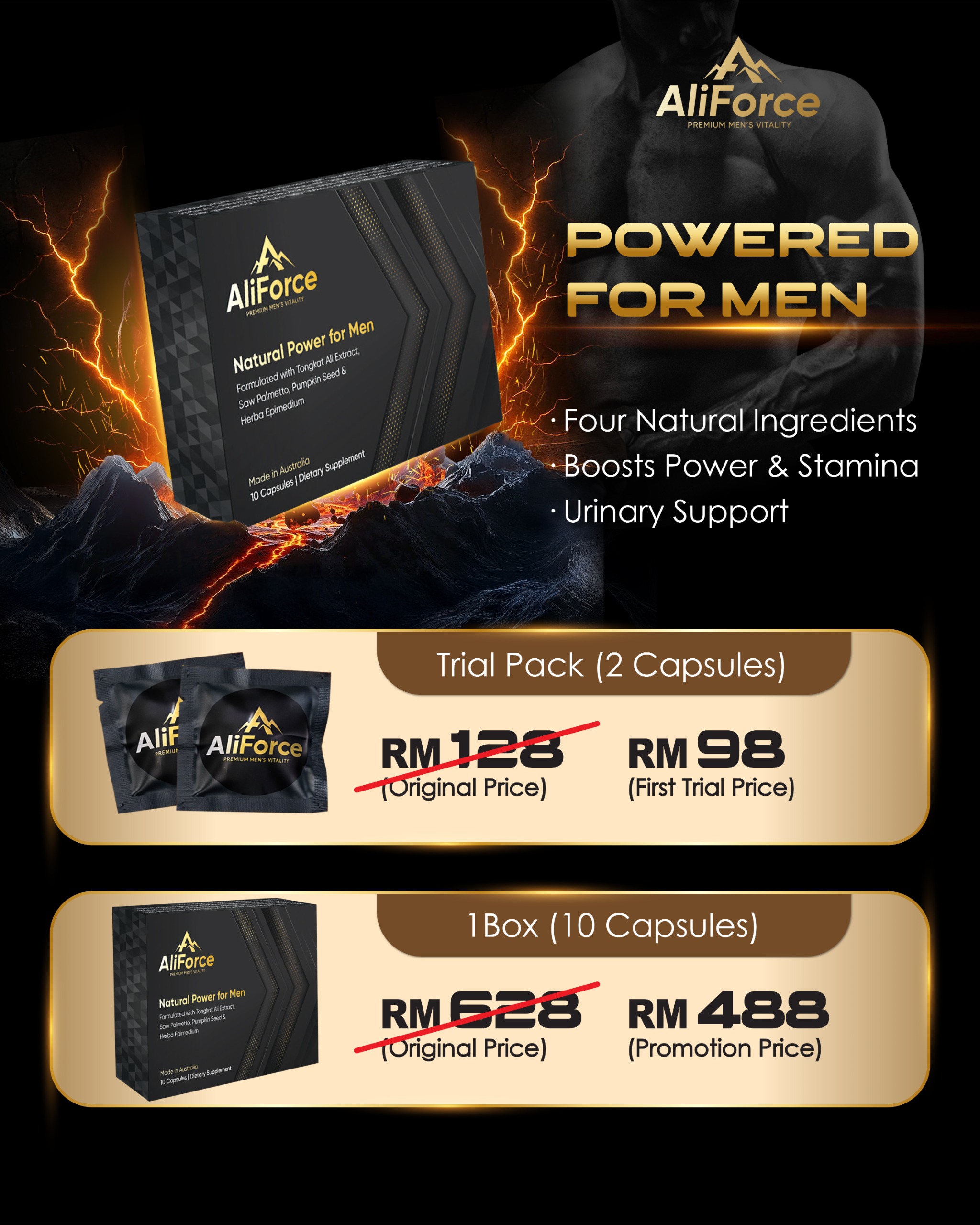 - Herbal extract blend: Tongkat Ali, Saw Palmetto, Pumpkin Seed, Epimedium